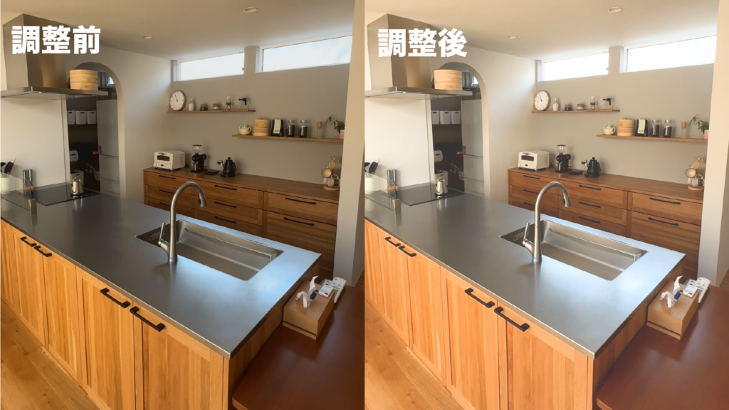 木目や素材感が際立ちます。住宅動画では特におすすめです。 - コントラスト:強すぎると不自然、弱すぎるとぼやける。